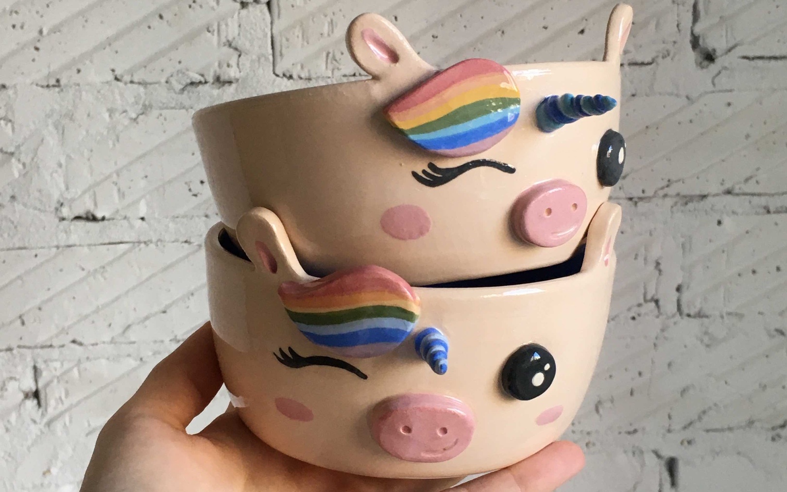 После всех технических сборов порядочных единорогов полагается раскрасить всеми цветами радуги, что дети с удовольствием и делают. Раскрашивают мордочки, гриву, уши, хвост специальными безвредными красками. А внутри выбирают яркую глазурь, который мы покроем после первого обжига.