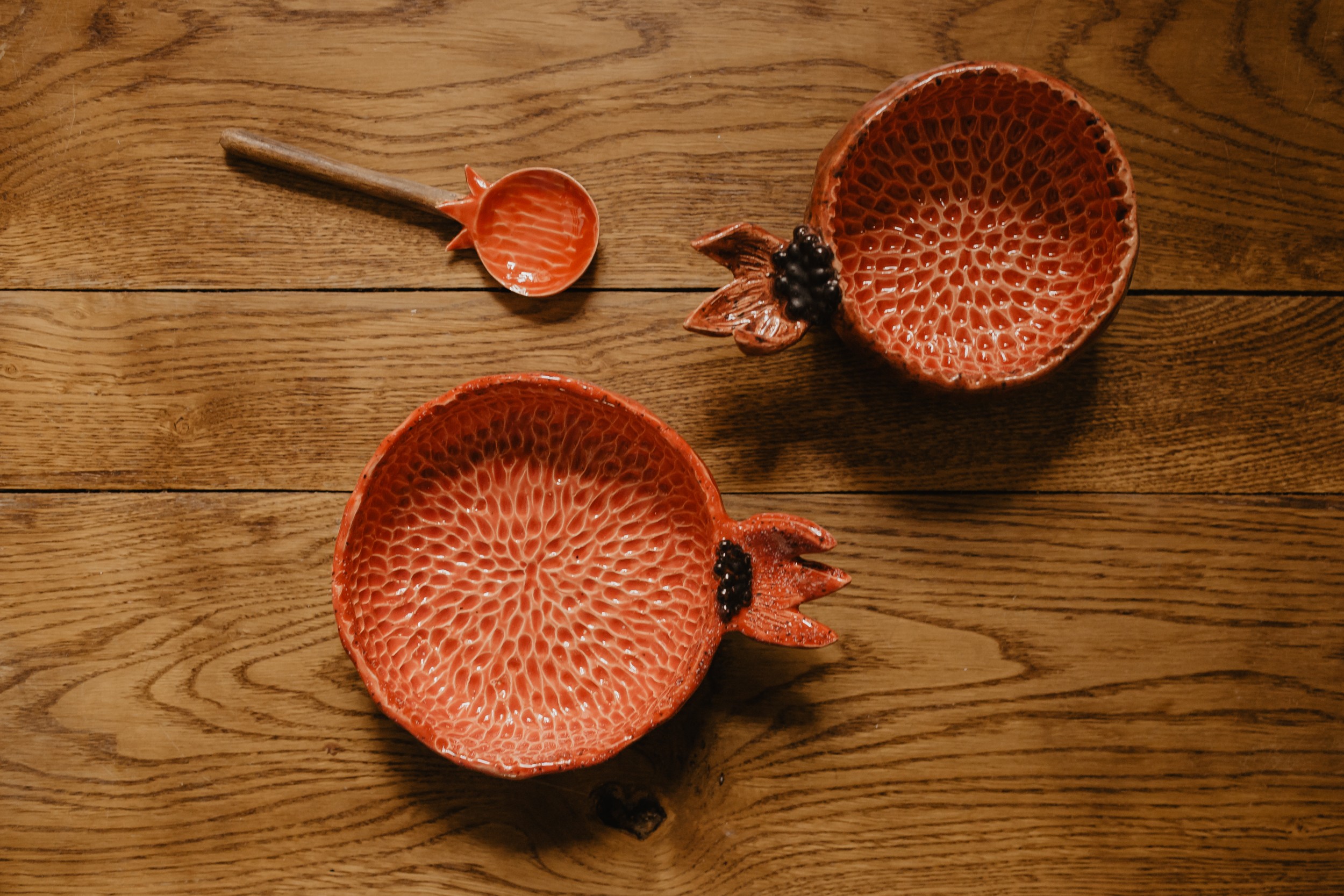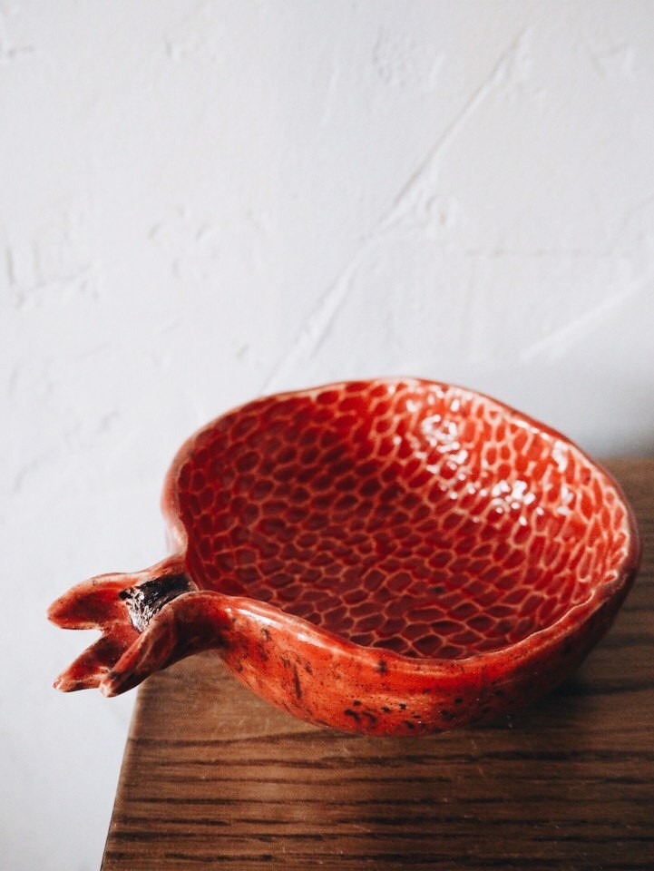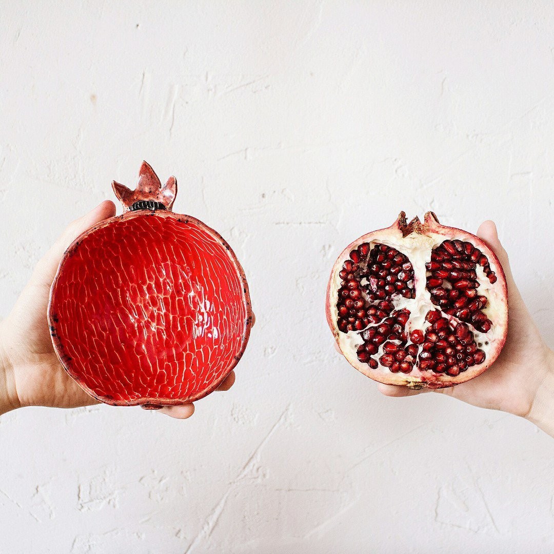 Вначале мы сделаем основу - вылепим саму мисочку. Далее - раскатаем небольшой пласт, будем рисовать, вырезать и примерять корону этой благородной особе. После соединяем, придаем лепесткам красивую форму, сушим и наносим декор. С помощью различных петель и стеков можно сделать самые разные точки, ямочки, "чешуйки". Расположить их симметрично или хаотично. Мисочка получается как самый настоящий спелый гранат в разрезе!