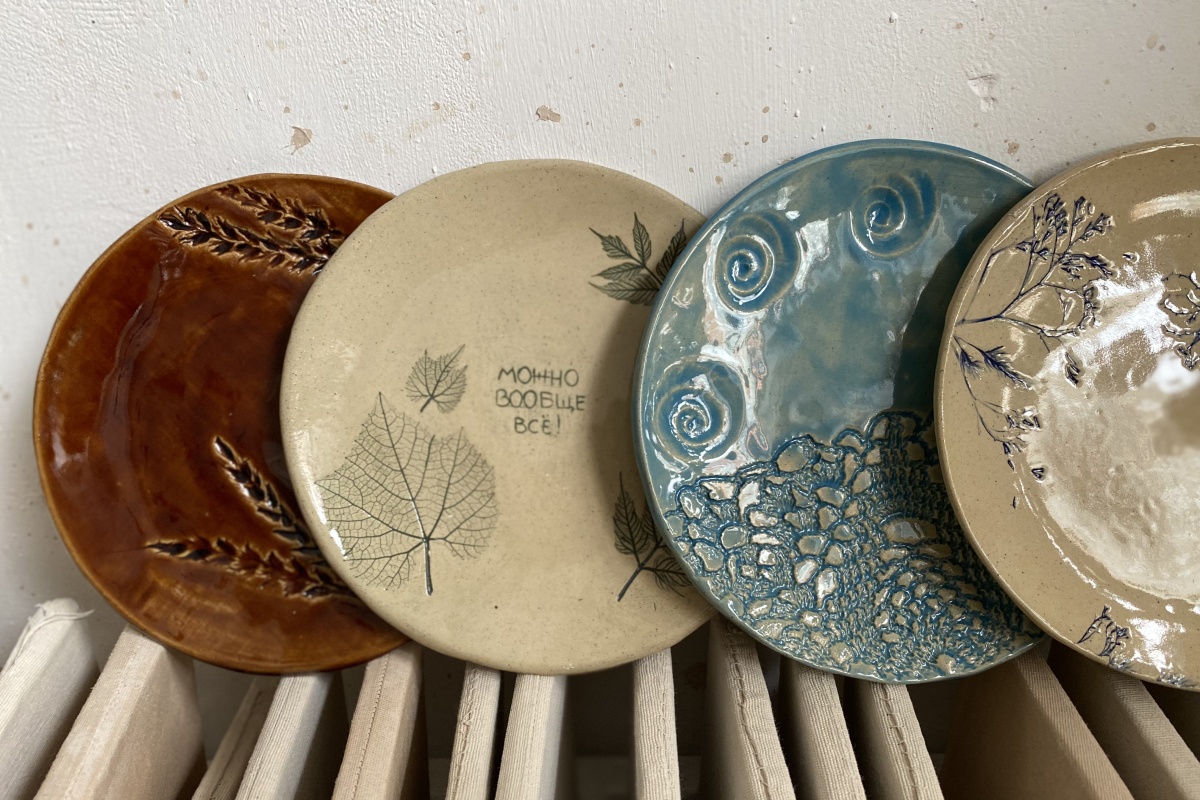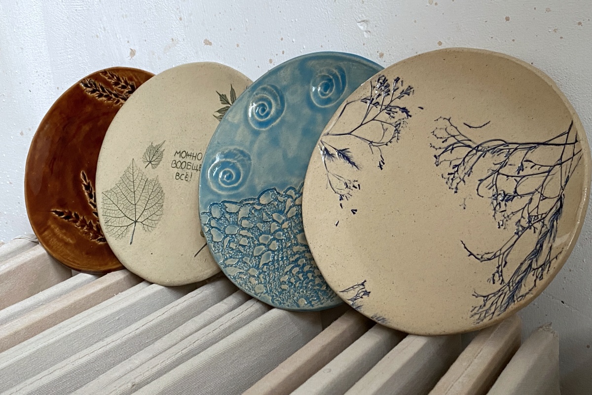 Мастер-класс очень простой, но 2 часа пролетают незаметно. Для того, чтобы сделать одну тарелку, нужно вначале от души простучать кусок глины, раскатать его ровно и тонко, тщательно проверить на возможные пузырьки воздуха. Потом загладить с двух сторон специальной пластинкой. Дальше самое творческое и интересное - придумываем узор, отпечатываем листья, кружева, штампики, фигурные скалки, все, что пожелаете!