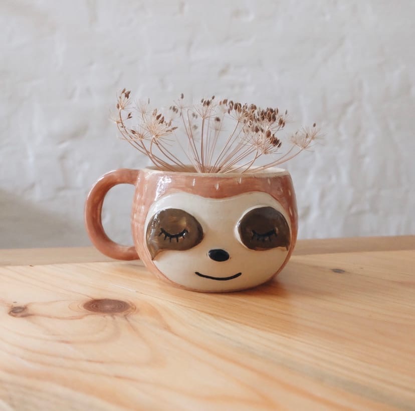 За гончарным кругом вы выкрутите малыша-ленивца, а затем в технике ручной лепки слепите ему мордочку, раскрасите ангобами и приклеите ручку.